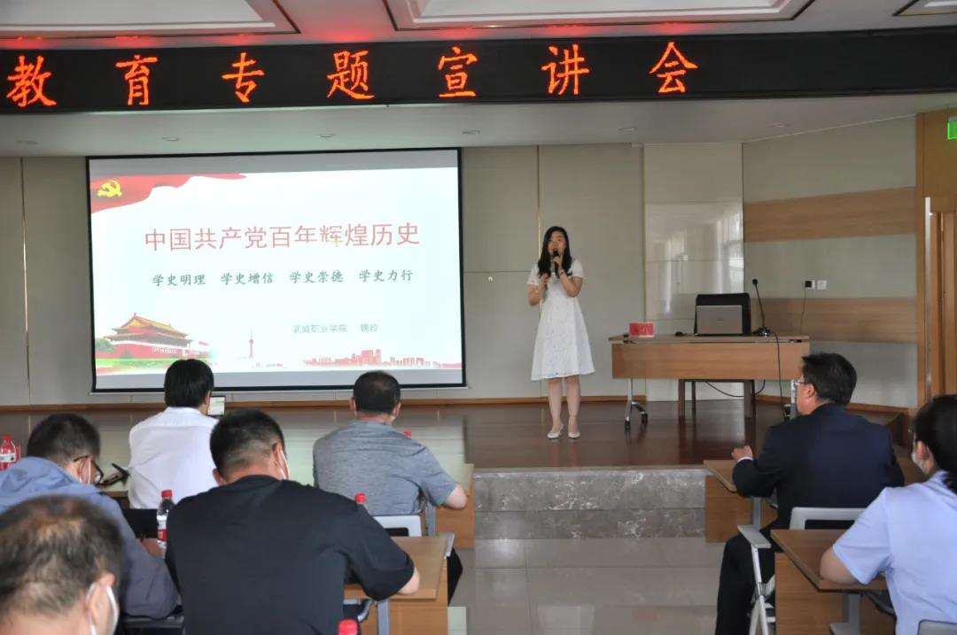 6月25日,按照武威市委統(tǒng)一安排,進一步把黨史學(xué)習(xí)教育作為增強“四個意識”、堅定“四個自信”、做到“兩個維護”的重要檢驗,甘肅普安制藥股份有限公司、甘肅省農(nóng)業(yè)工程技術(shù)研究院、甘肅農(nóng)墾藥物堿廠有限公司三個單位聯(lián)合舉辦了黨史學(xué)習(xí)教育專題宣講會。會議邀請武威市委宣講團成員、武威職業(yè)學(xué)院講師魏玲作黨史學(xué)習(xí)教育專題宣講——《中國共產(chǎn)黨百年輝煌歷史》。