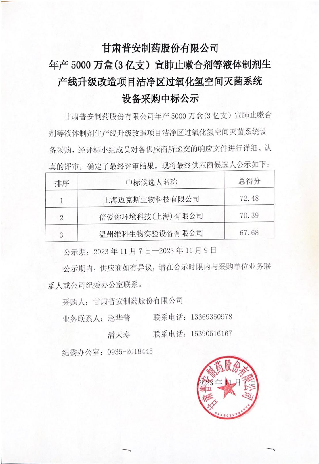 甘肅普安制藥股份有限公司年產(chǎn)5000萬盒(3億支)宣肺止嗽合劑等液體制劑生產(chǎn)線升級(jí)改造項(xiàng)目潔凈區(qū)過氧化氫空間滅菌系統(tǒng)設(shè)備采購中標(biāo)公示