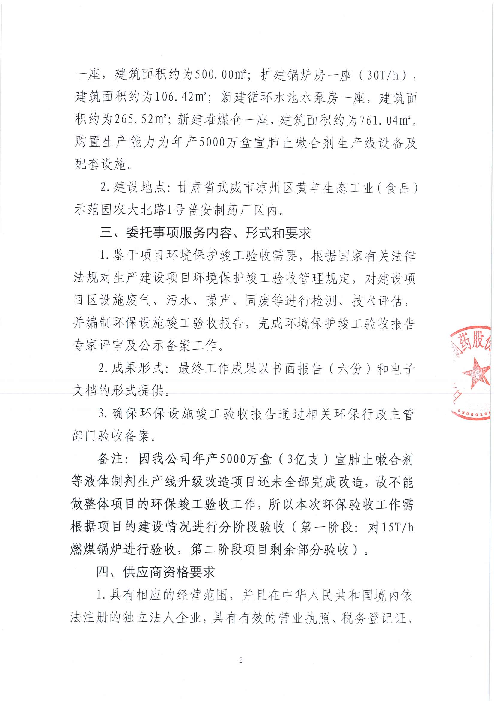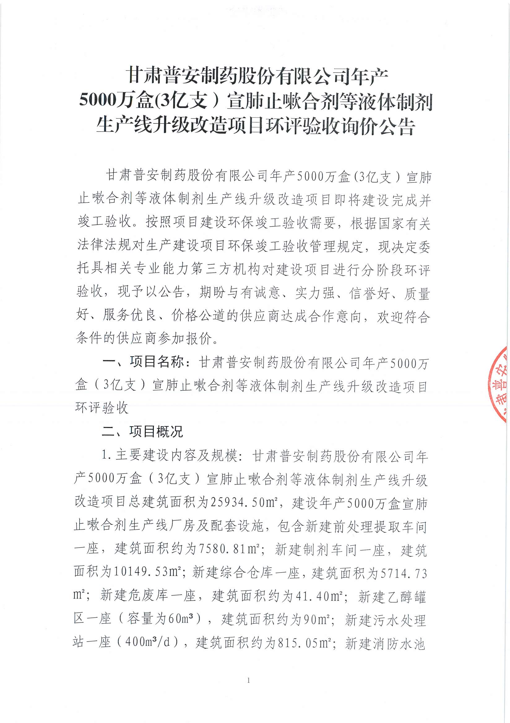 甘肅普安制藥股份有限公司年產(chǎn)5000萬盒(3億支)宣肺止嗽合劑等液體制劑生產(chǎn)線升級改造項目環(huán)評驗收詢價公告