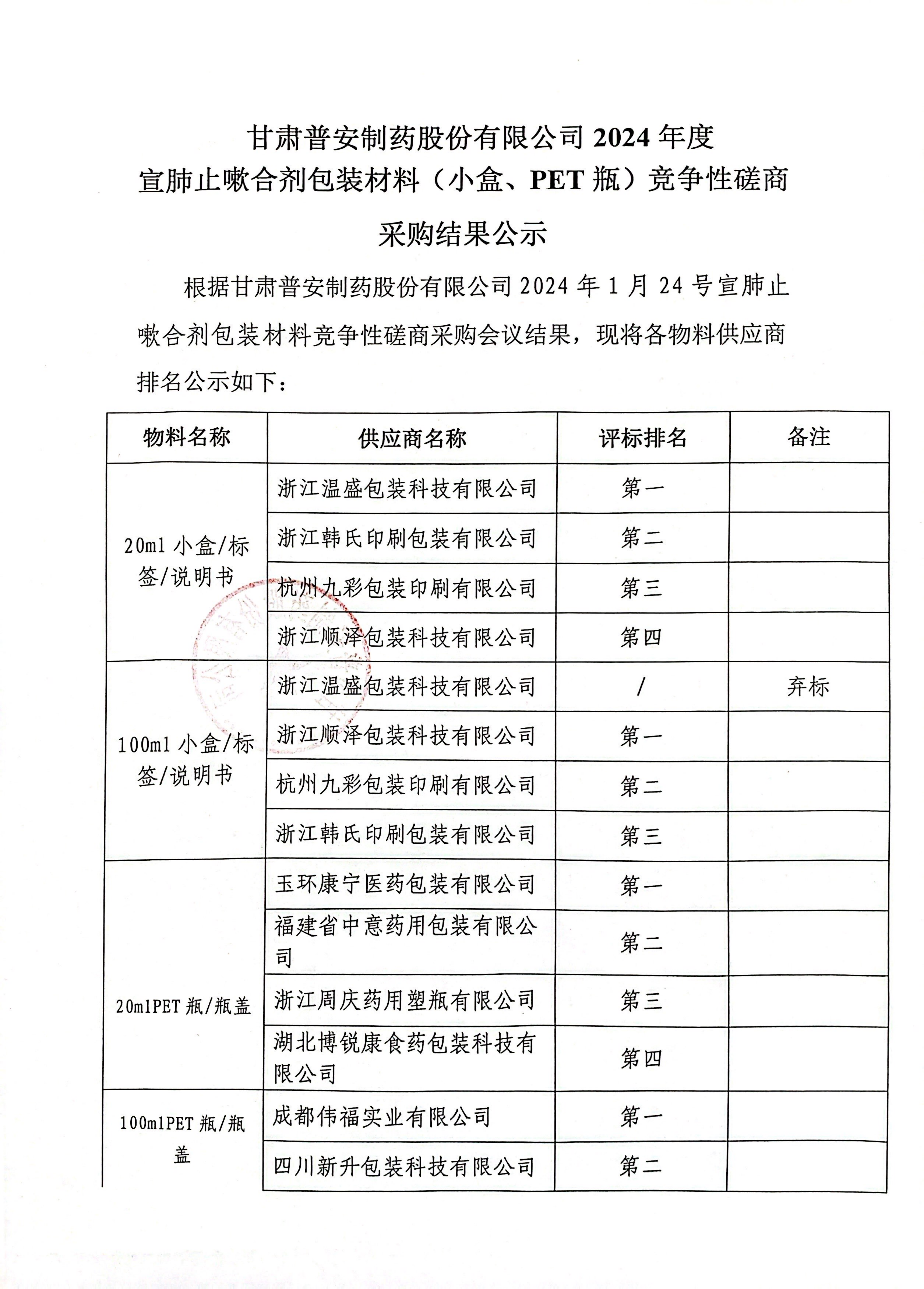 甘肅普安制藥股份有限公司2024年度宣肺止嗽合劑包裝材料(小盒、PET瓶)競爭性磋商采購結果公示