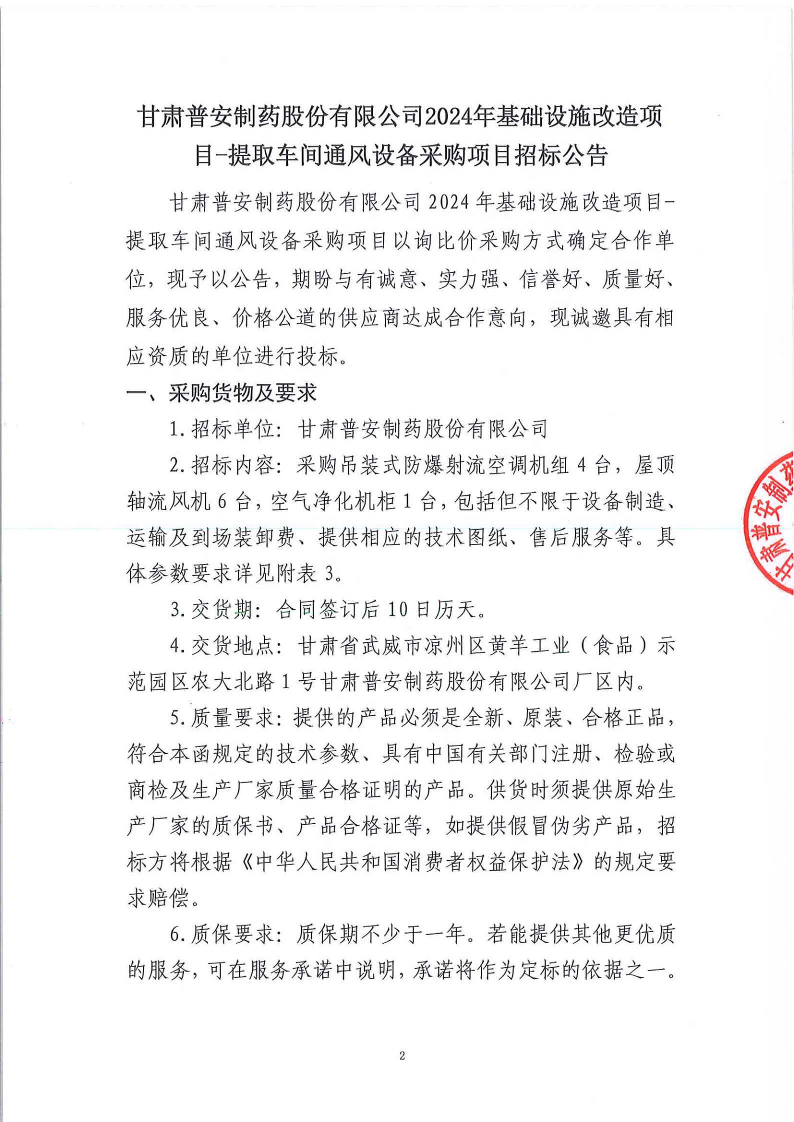 甘肅普安制藥股份有限公司2024年基礎(chǔ)設(shè)施改造項目-提取車間通風設(shè)備采購項目招標公告